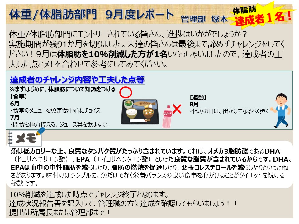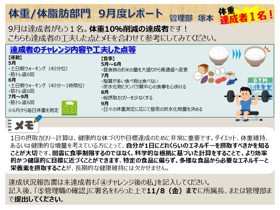 体重/体脂肪部門は、47名エントリーし、2025年5月1日から10月31日の6か月間の間に、「体重」「体脂肪」いずれかを10%削減するチャレンジを実施しています。